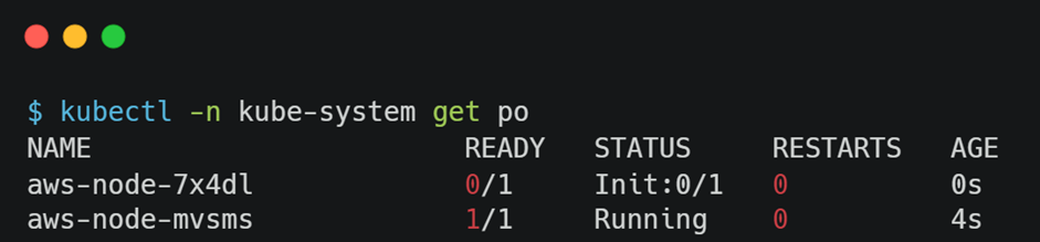 VCP CNI를 설정하면 aws-node pod가 재부팅됩니다. aws-node pod가 정상상태인 것을 확인합니다.