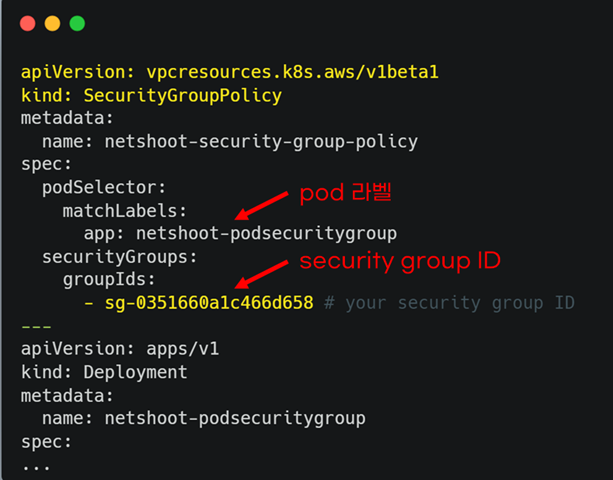 - github 예제 코드 링크: https://github.com/choisungwook/eks_pod_security_group/blob/main/k8s_manifests/netshoot_with_securitygroup.yaml