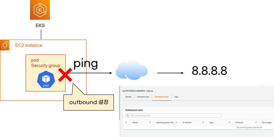 왜냐하면 netshot pod에 적용한 securitygroup outbound에서 ICMP허용 규칙이 없기 때문입니다.