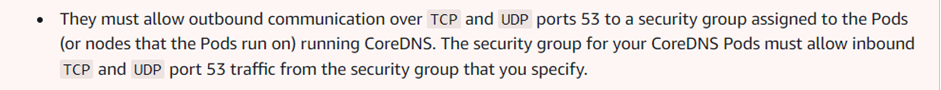 security group for pod 문서에서도 coredns를 사용하기 위해, DNS프로토콜을 security group에 설정하라고 가이드합니다.