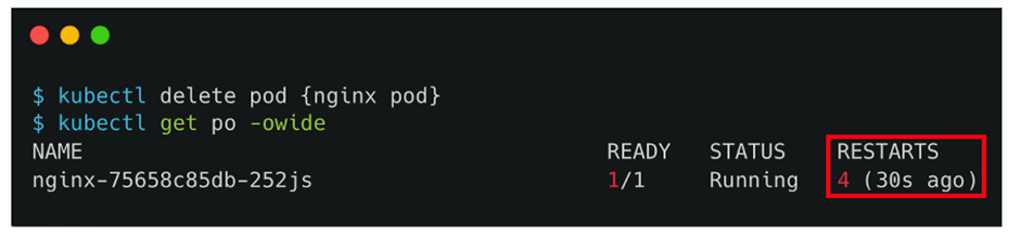 nginx pod를 삭제하고 상태를 확인해보지만 여전히 pod가 비정상정입니다. nginx pod가 probe를 실패하여 계속 재시작되고 있습니다.