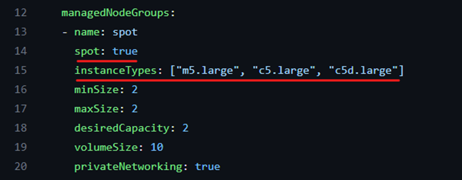 저는 security group for pod를 실습하기 위해 eksctl로 EKS를 생성했습니다. security group for pod를 사용할 수 있는 인스턴스를 지정하고 비용을 절약하기 위해 spot인스턴스를 사용했습니다.