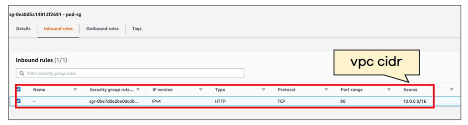 pod가 사용하는 security grouppolicy inbound에 probe 포트를 추가합니다. 소스는 노드 IP를 적어야 하는데, pod가 재생성되어 다른 노드로 변경되면 노드 IP가 변경됩니다. 그래서 저는 테스트이기 때문에 vpc cidr를 설정했습니다. 실제 업무에 적용한다면 subnet대역을 설정할 것 같습니다.