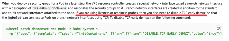 security group for pod가 probe를 사용하려면 VPC CNI설정이 필요합니다. security group for pod 문서를 확인하면 probe를 사용하기 위해 TCP early demux를 disable해야 한다고 설명합니다.
