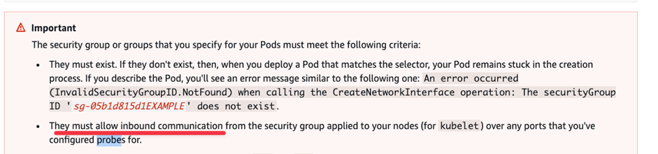 security group for pod 문서에서도 probe사용시 주의사항을 가이드합니다.