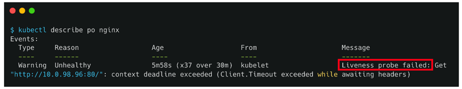pod가 왜 정상이 아닌지 describe명령어로 확인할 수 있습니다. liveness probe가 실패하여 pod가 비정상상태입니다.