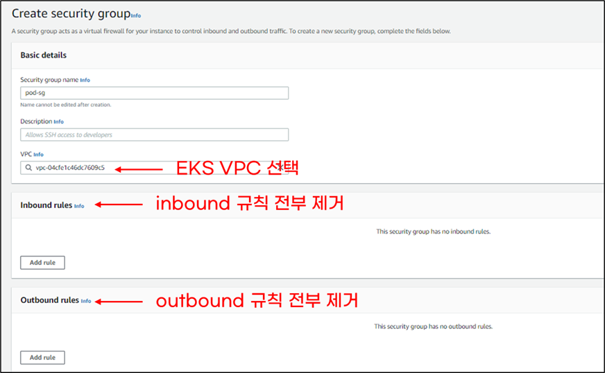 pod에 적용할 security group을 생성합니다. VPC는 EKS가 있는 VPC를 선택합니다. 그리고 inbound, outbound 규칙을 전부 제거합니다.