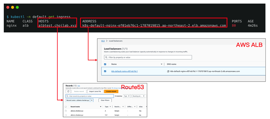 nginx pod와 service, ingress를 생성합니다. 쿠버네티스 리소스와 AWS 리소스가 잘 생성되었는지 확인합니다.