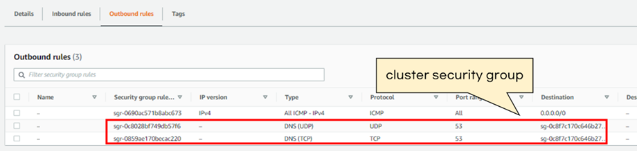 netshoot pod에 적용된 security group에는 outbound에 DNS 프로토콜 TCP/UDP를 추가합니다. 소스는 cluster security group입니다.