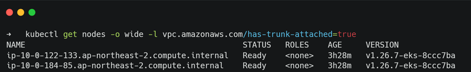 kubectl get nodes -o wide -l vpc.amazonaws.com/has-trunk-attached=true