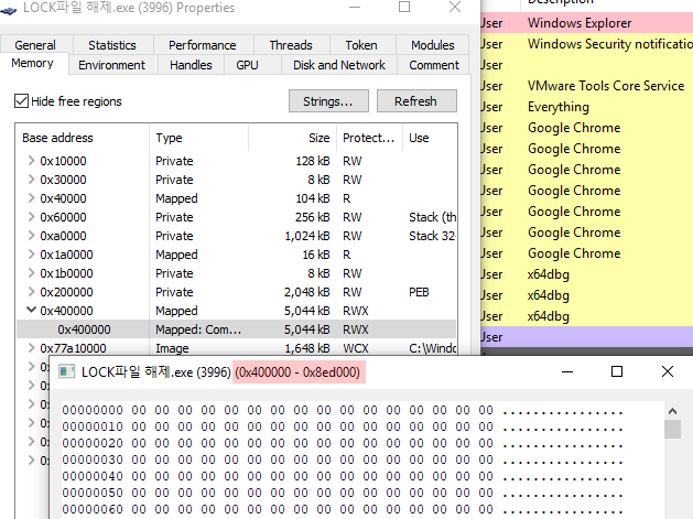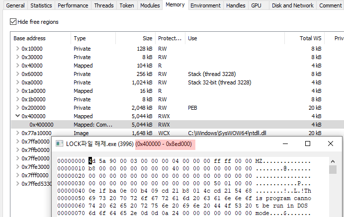 Process Hacker로 자식 프로세스 0x00400000메모리 영역을 확인해봅시다.
