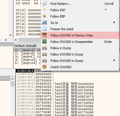 [그림 27]단계의 스택창에서 첫 번째 인자에 마우스 오른쪽 버튼을 누르고 Follow DWORD in Memory Map을 클릭합니다.
