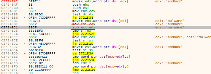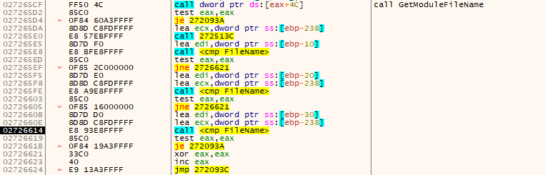 샌드박스 자동분석을 감지하기 위해 파일 이름을 검사합니다. 악성코드가 설정한 파일 이름이 있으면 프로세스를 강제 종료합니다. 파일 이름은 GetModuleFileName API함수를 사용해서 가져옵니다.