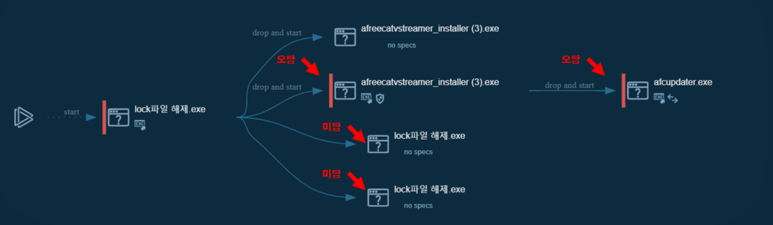 lock.exe는 자식 프로세스에 악성코드를 인젝션했지만 탐지하지 못한 미탐을 했습니다. 아프리카tv클라리언트 설치 프로그램은 악성코드가 아님에도 불구하고 악성코드라고 의심하는 오탐을 합니다.