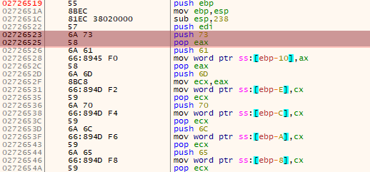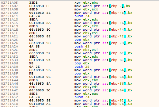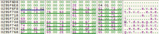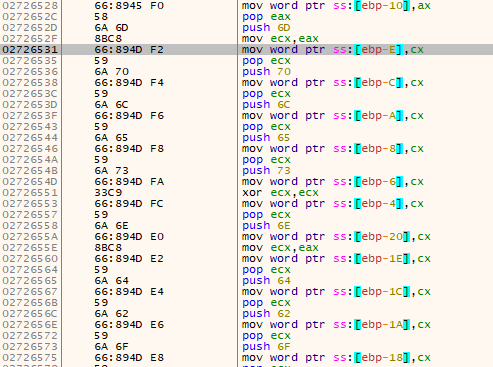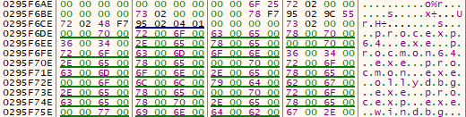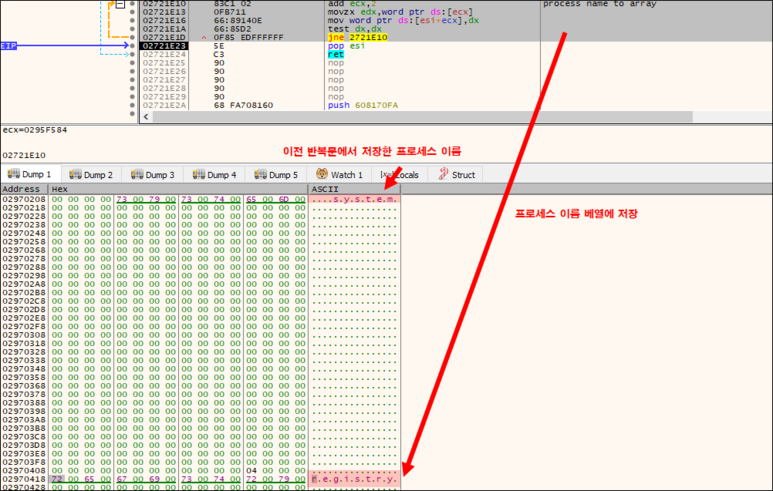 연속해서 이름을 저장하는 것이 아니라 약 0xe0거리를 두면서 저장합니다. 아마도 백신 탐지를 피하는 것과 분석을 방해하기 위한 것으로 생각합니다.