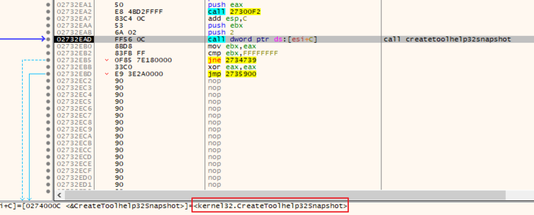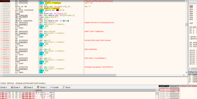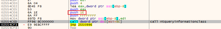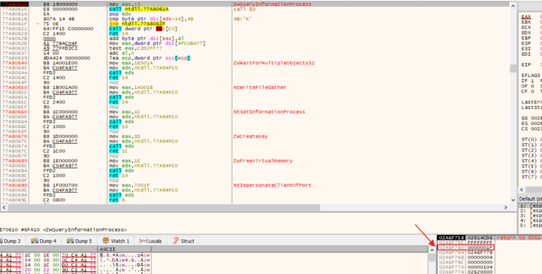 다시 F9를 눌러 스택창 3번째 값이 0x1E인지 확인하고 중지합니다. 그리고 Alt + F9를 눌러 NtQueryInformationProcess함수를 호출한 곳으로 이동합니다.
