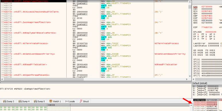 NtViewOfSection에서 브레이크포인트를 설정하고 F9를 눌러 실행합니다. 스택창을 확인하면 악성코드 자기자신에게 생성했던 섹션을 연결합니다.