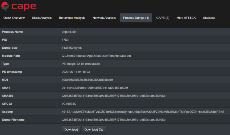 쉘코드가 복호화된 악성코드는 CAPE샌드박스의 Process Dumps에서 다운로드 받을 수있습니다.