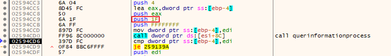 X32dbg로 악성코드를 열고 NtQueryInformationProcess함수에 브레이크포인트를 설정합니다. 그리고 스택창 3번째 인자가 0x1F가 될 때까지 F9번을 눌러 실행합니다. 발견하면 Alt + F9(return User code)를 눌러 NtQueryInformationProcess함수를 호출한 곳으로 이동합니다.