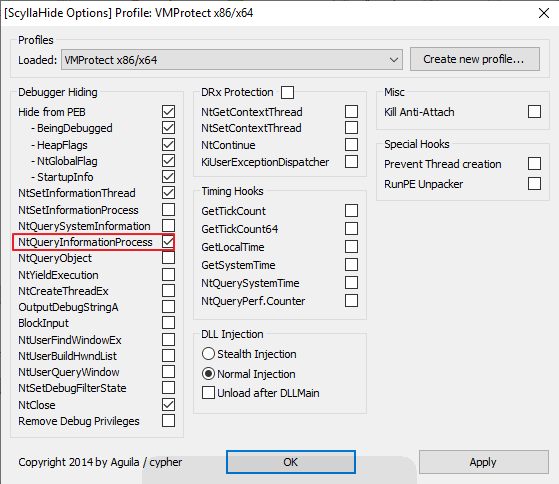 SycllaHide플러그인에서 NtQueryInformationProcess체크박스를 선택하면 안티 디버깅이 쉽게 우회된 것을 알 수 있습니다.