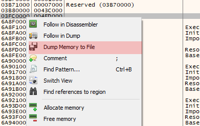 이동된 메모리 맵에서 오른쪽 버튼을 클릭 후 Dump Memory to File 메뉴를 선택하여 파일로 추출합니다.