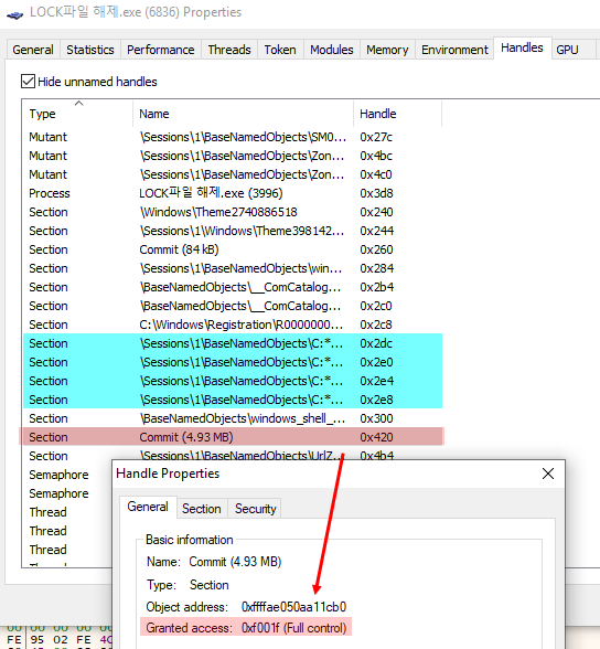 NtCreateSection에 브레이크포인트를 설정하고 실행합니다. 브레이크포인트에 멈추면 ALT + F9를 누릅니다. Process Hacker → Handles탭을 확인하면 Full Control권한인 섹션이 생겼습니다. 이 섹션은 공유 메모리 역할을 합니다.