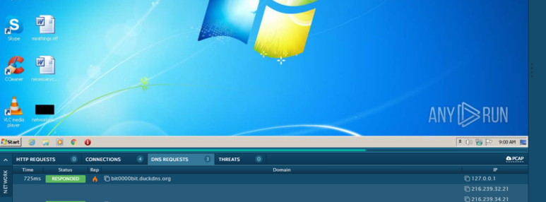 의심스러운 악성행위는 dns쿼리밖에 발견하지 못했습니다. 현재 해당 서버가 없기 때문에 127.0.0.1로 변환되었습니다.