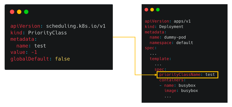 쿠버네티스 PriorityClass 리소스를 생성하고 pod에 적용하면 됩니다. Pod에 적용할 때는 spec.priorityClassName필드에 설정합니다.