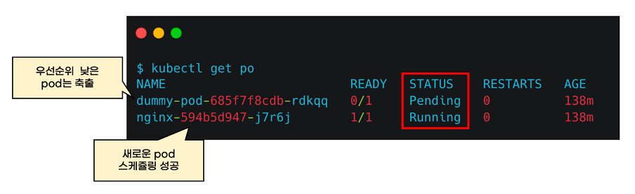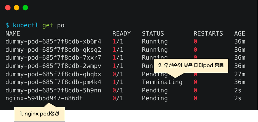 nginx pod는 더미 pod보다 우선순위가 높아서 스케쥴링이 됩니다. nginx pod가 스케쥴링 될 때 노드의 메모리를 확보하기 위해 더미 pod 한 개를 제거합니다.