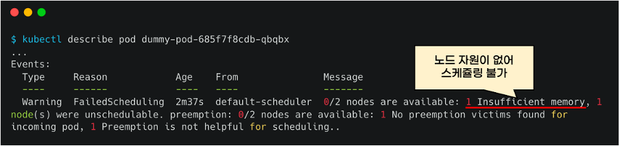 descirbe pod를 하면 스케쥴링을 왜 못하는지 이벤트 상세내용이 있습니다.