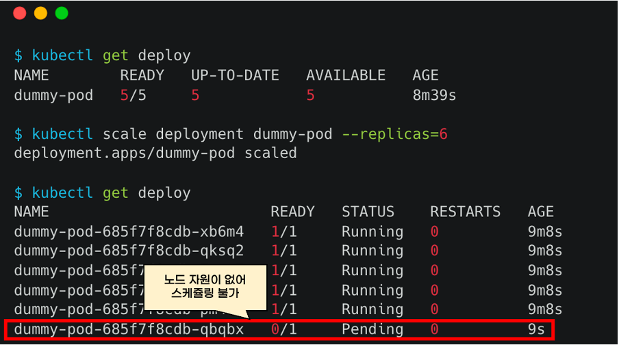 더 이상 노드 자원이 없으므로 pod는 pending상태입니다.