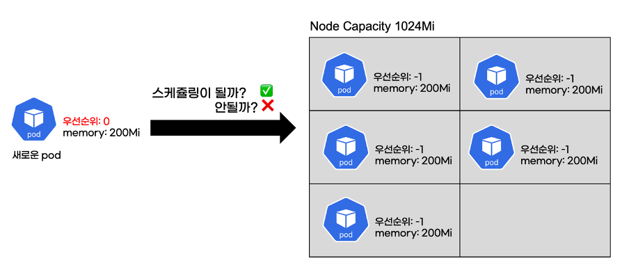 예를 들어, 1024Mi 용량을 갖는 노드가 있다고 가정해봅시다. 이 노드에는 200Mi 메모리를 사용하는 우선순위가 -1인 5개의 pod가 있습니다. 이 상황에서 -1보다 우선순위 높은 pod가 생성되면, 새로운 pod는 스케쥴링이 될까요? 숫자가 높을수록 우선순위가 높습니다.