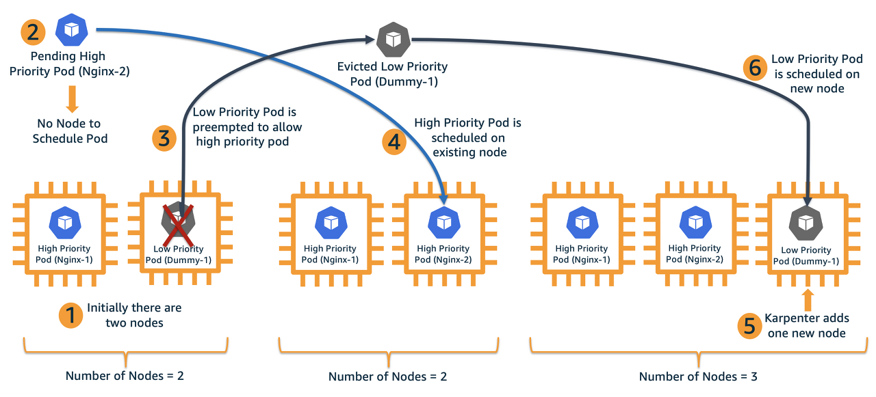 시간이 지나면서 미리 생성한 노드도 자원이 없는 상황이 생깁니다. 사용자가 요청한 pod를 스케쥴링 하기 위해 kube-scheduler는 우선순위 낮은 pod를 제거합니다. pod가 제거되면 해당 pod는 pending상태가 됩니다. 그리고 카펜터가 pending상태를 감지하여 노드를 또 생성하고 생성된 노드에 우선순위 낮은 pod가 스케쥴링됩니다 . 이 과정이 반복되면서 새로운 노드 사용대기 시간을 최소화합니다.