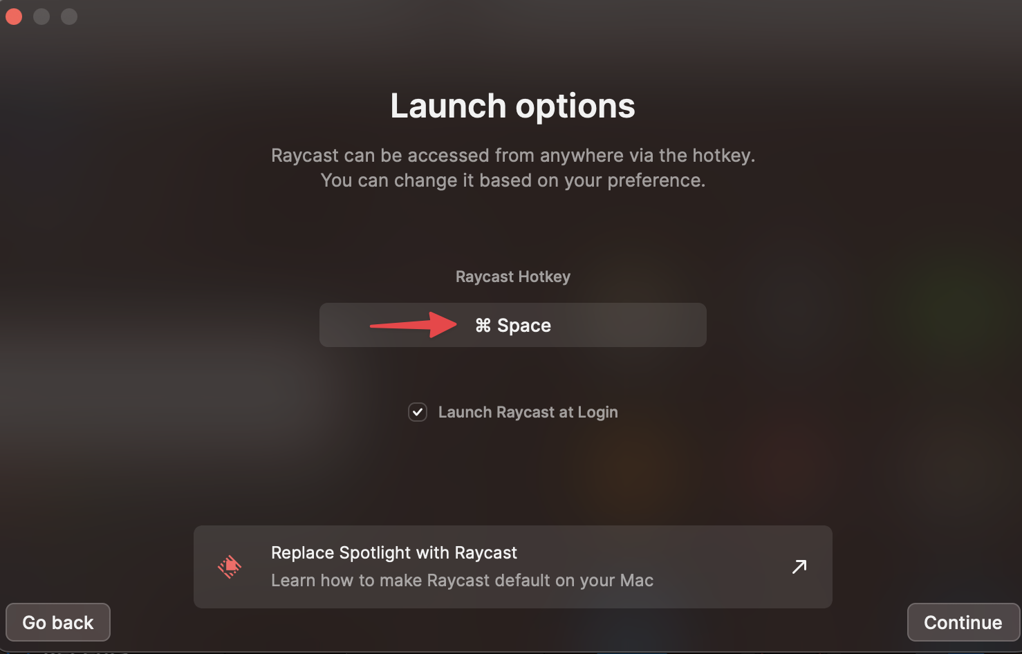 Raycast단축키를 command + space로 설정합니다. 저는 튜토리얼 단계에서 단축키를 설정했습니다.