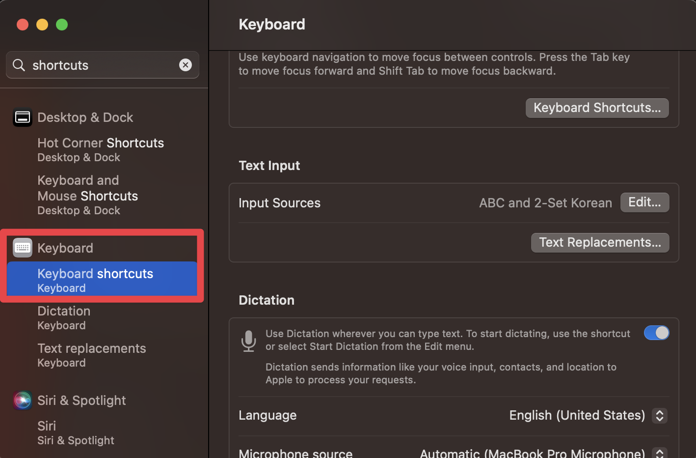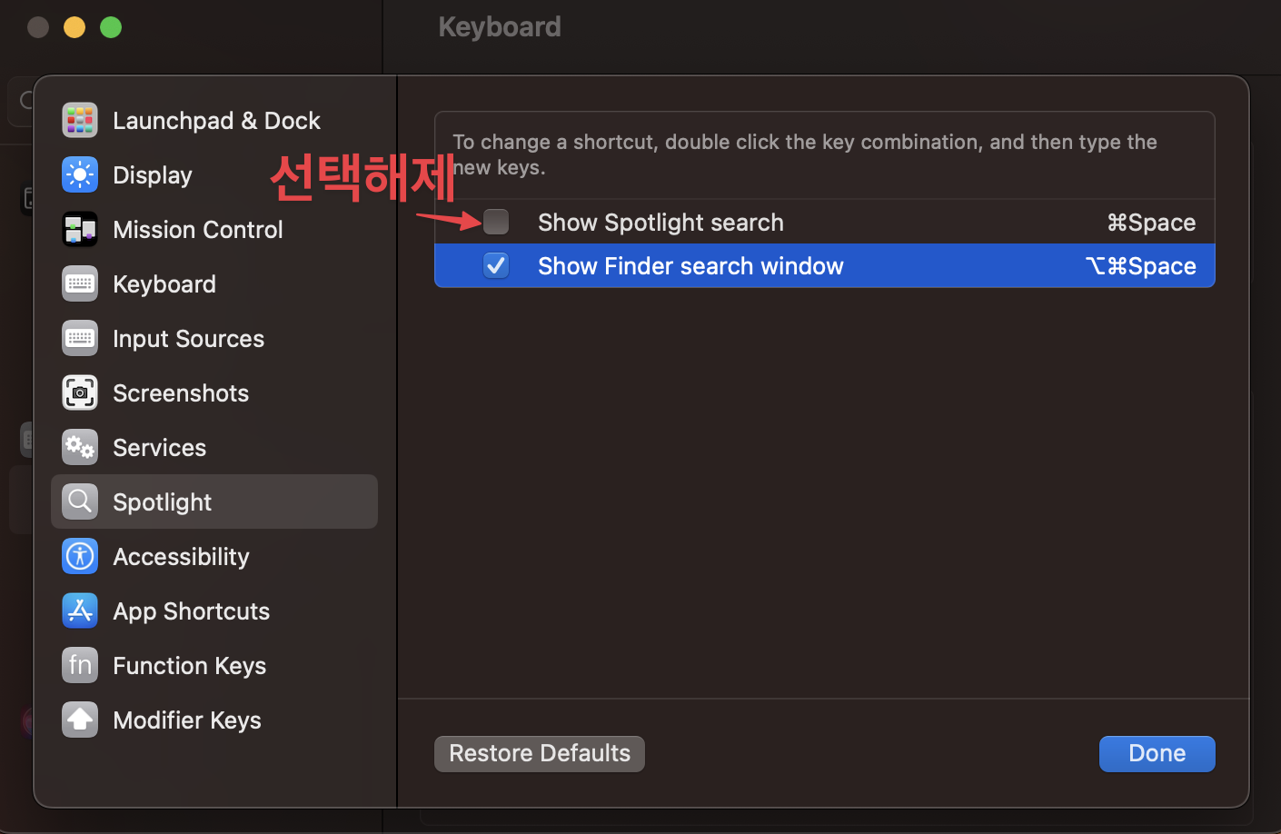 먼저 spotlight 단축키를 제거합니다. [설정] -> [keyboard shortcuts] 메뉴로 이동합니다.
