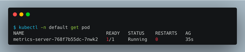 default 네임스페이스에 metrics sevrer pod가 잘 실행되었는지 확인합니다.