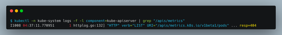 API server로그를 보면 metrics API요청을 404로 응답했습니다.
