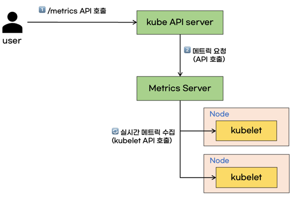 metrics server는 메트릭을 노출시키기 위해, 직접 kubelet API를 호출하여 메트릭을 수집합니다. metrics server는 HPA(Horizontal Pod Autoscaling), kubectl top 명령어 등에서 사용합니다.