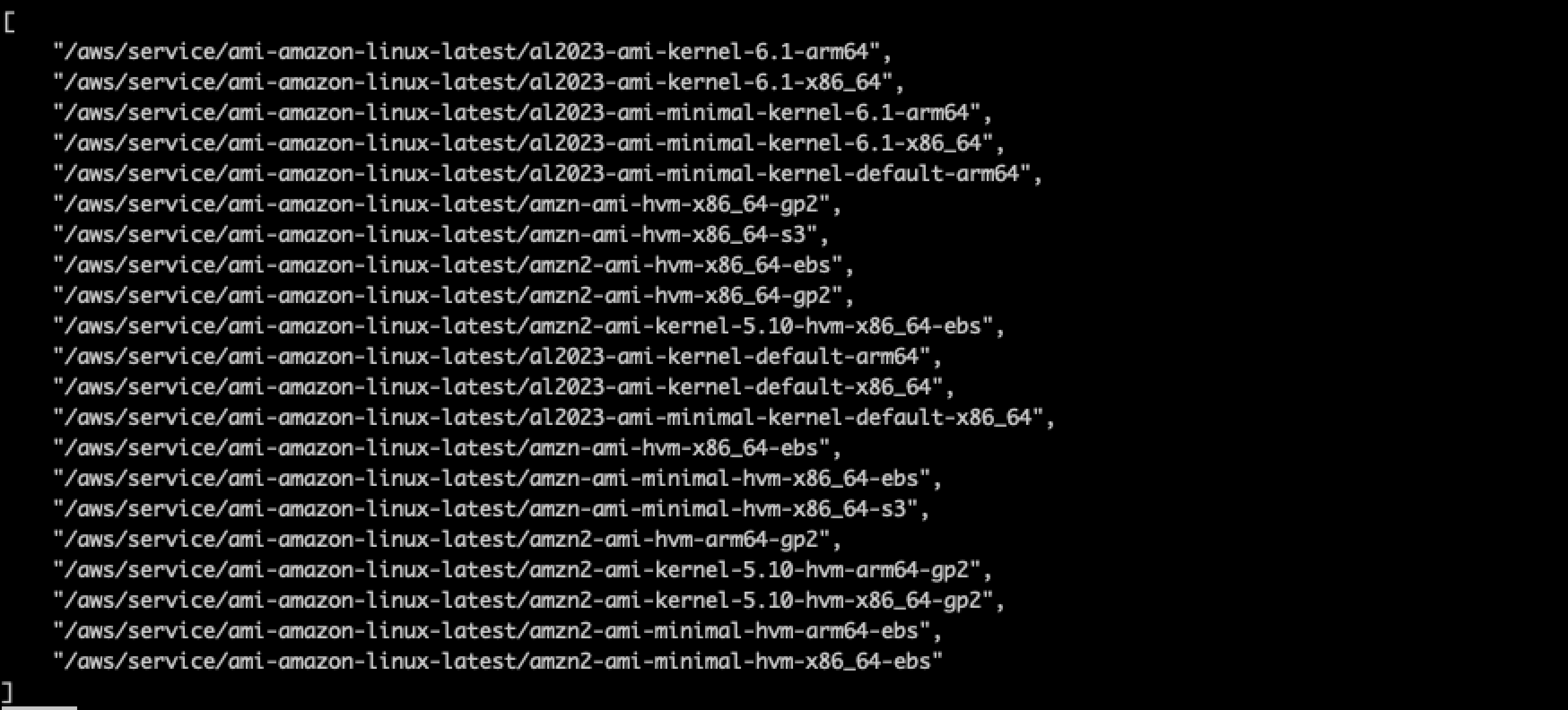 get-parameters-by-path는 System Manger에 있는 값을 조회하여 AMI를 찾습니다. AWS는 System Manager에 특정 AMI정보를 업데이트합니다. 예를 들어 latest AMI가 있습니다.