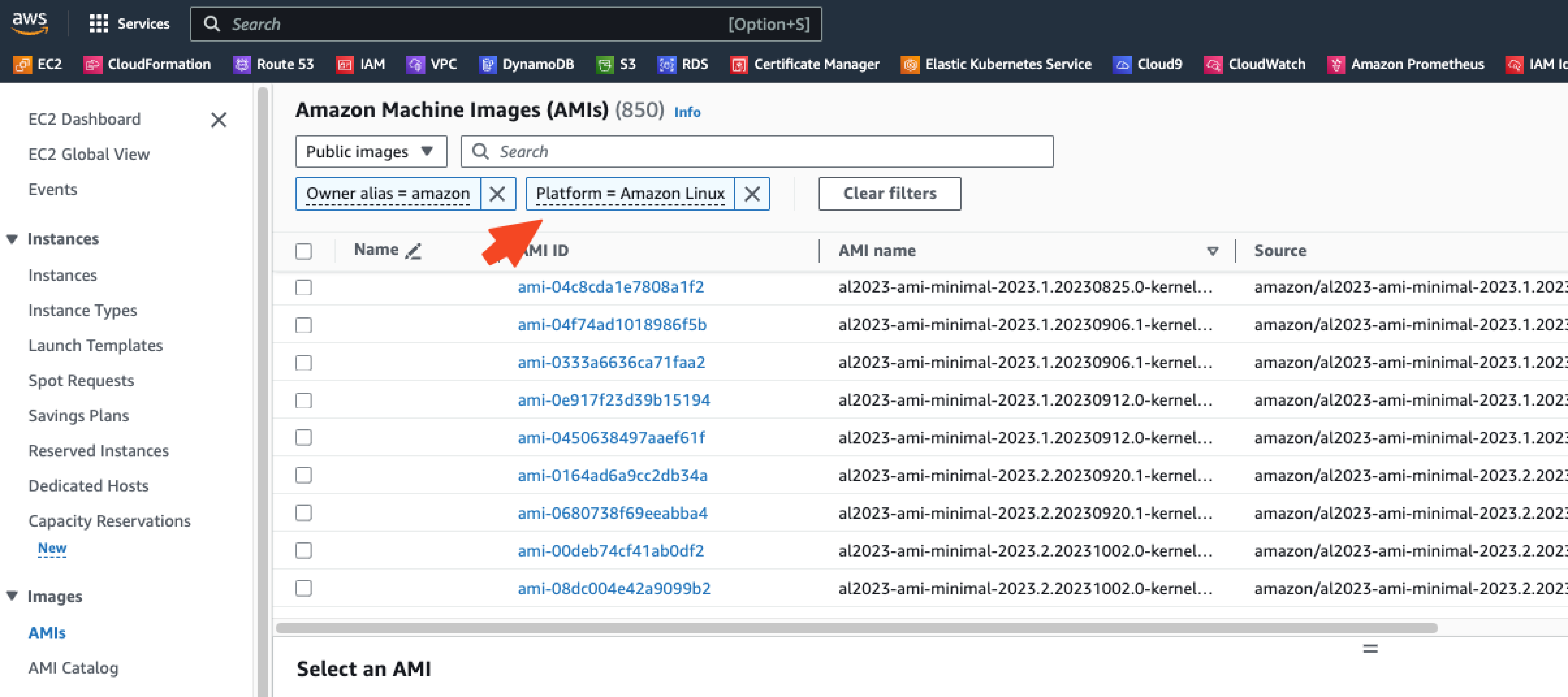 저는 기본 필터 규칙을 amazon이 관리하는 AMI를 설정했습니다. “public Image”를 선택하고 “Owner alias”를 amazon으로 설정했습니다.