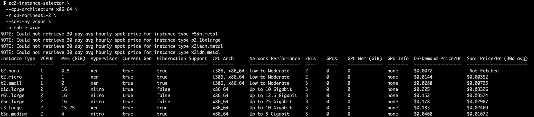 amazon-ec2-instance-selector는 AWS CLI단점을 보완한 도구입니다. 인스턴스 필터 규칙을 매우 쉽게 작성합니다. 설치와 사용방법은 github을 참고해주세요.