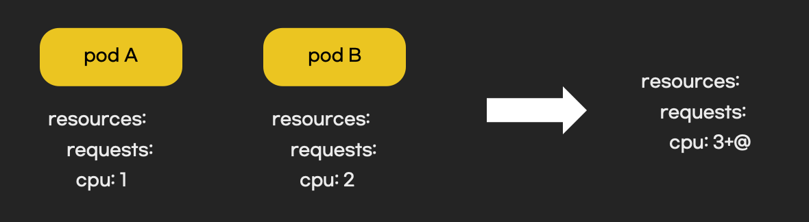 예를 들어 아래 그림 처럼 2개 pod가 있으면, 인스턴스 후보의 cpu는 3코어를 초과해야 합니다. 그리고 NodePool에 정의한 인스턴스 옵션을 고려하여 최종 인스턴스 후보를 결정합니다.