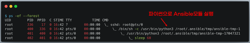 Ansible이 실행되는 동안 managed-node 프로세스 상태를 확인하면, 파이썬이 Ansible모듈을 실행하고 있는 것이 보입니다.