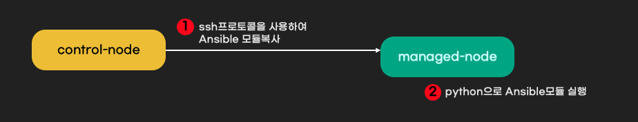 Ansible은 control-node가 ansible을 실행하여 managed-node에 코드를 실행하는 구조입니다. control-node는 ssh프로콜을 사용하여 managed-node에 ansible모듈을 복사합니다. managed-node는 전달받은 ansible모듈을 파이썬으로 실행합니다.