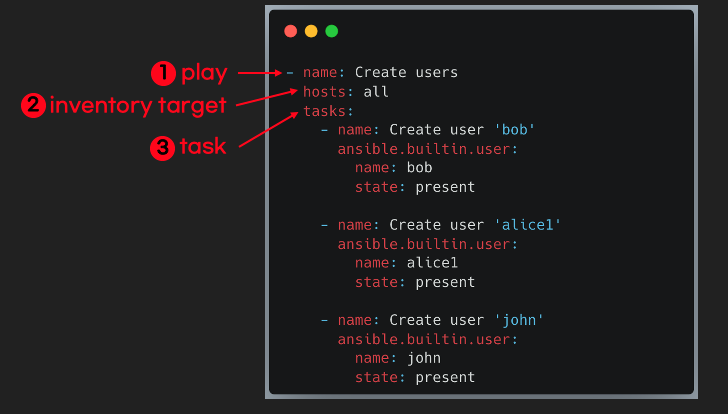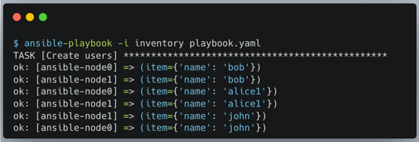 Ansible에서 여러 task를 수행하려면 ansible 명령어를 여러번 실행해야 합니다. 아래 예제는 bob, alice, john계정을 생성하는 예제입니다.