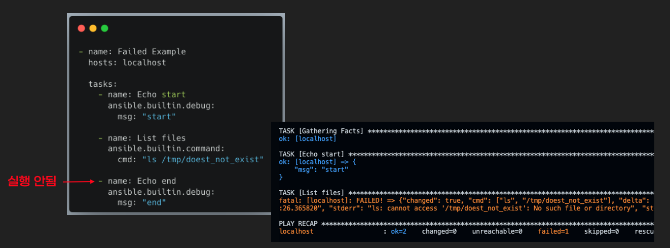 playbook은 실행한 taks결과가 실패라면 다음 task를 실행하지 않습니다.