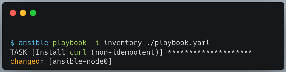 command 모듈이 멱등성을 보장하지 않는 대표적인 모듈입니다. command 모듈은 명령어를 무조건 실행하기 때문에, 여러 번 command모듈을 실행하면 결과가 달라질 수 있습니다. command모듈은 항상 ansible 실행 결과가 changed로 나옵니다.