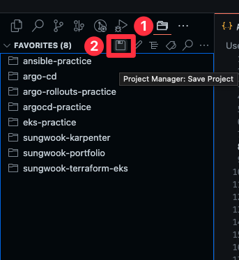 먼저 vscode로 즐겨찾기할 프로젝트를 엽니다. 그리고 Project Manager extension을 열고 저장버튼 아이콘을 클릭합니다. 프로젝트 이름을 입력하면 Project Manager목록에 이름이 표시됩니다. 이제 목록에서 프로젝트 이름을 클릭하면 vscode가 클릭한 프로젝트를 엽니다.