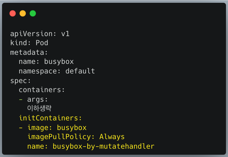 busybox에는 놀랍게도 initContainer가 있습니다. busybox pod manifest에는 initContainer를 설정하지 않았지만, 저희가 개발한 Admission controller 변조 핸들러가 initContainer를 추가했습니다.