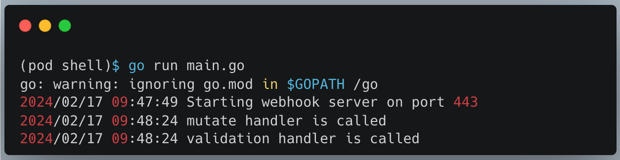 pod생성에 대해 webhook을 설정했으므로, pod를 생성할 때마다 웹서버의 검증 핸들러가 동작합니다.